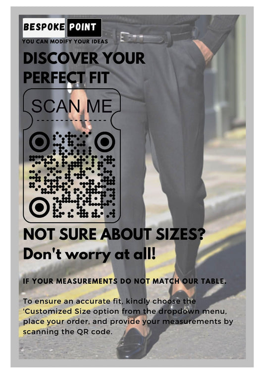 At Bespoke Point, we understand the importance of fit and guarantee that, should you carefully follow the offered measuring chart when sending us your measurements, you will receive the ideal suited outfit. Our team of experts is dedicated to ensuring that you receive a perfectly tailored outfit that meets your specifications.